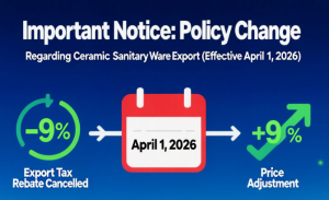 С 1 апреля 2026 года скидка на экспортный налог НДС на фарфоровую и гончарную сантехнику была официально отменена. Это означает, что стоимость предприятий по экспорту сантехники будет увеличиваться напрямую, а пространство прибыли будет сжиматься, заставляя предприятия повышать цены за рубежом или оптимизировать структуру продукта.